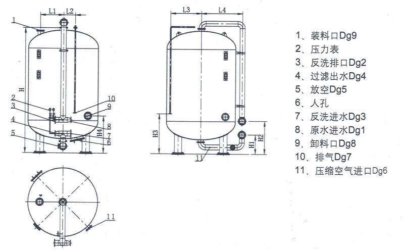 本設(shè)備將濾料(白煤、石英砂)裝填于密閉的壓力容器內(nèi),利用外加壓力克服濾層阻力進(jìn)行過(guò)濾。